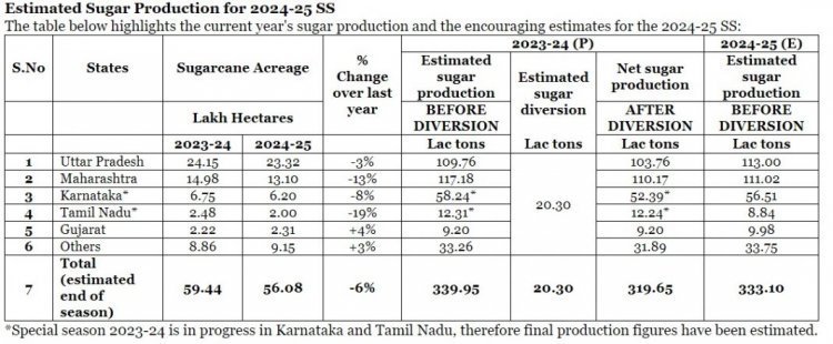 In July last year, ISMA had forecasted gross sugar production of 333.10 lakh tonnes (before diversion for ethanol production) for the 2024–25 sugar season (Oct.-Sep.). However, the actual production is likely to be 38 lakh tonnes (11.41%) lower than the first preliminary estimate by ISMA and 45 lakh tonnes (13.2%) less than the gross sugar production of 340 lakh tonnes in Sugar Season 2023-24.