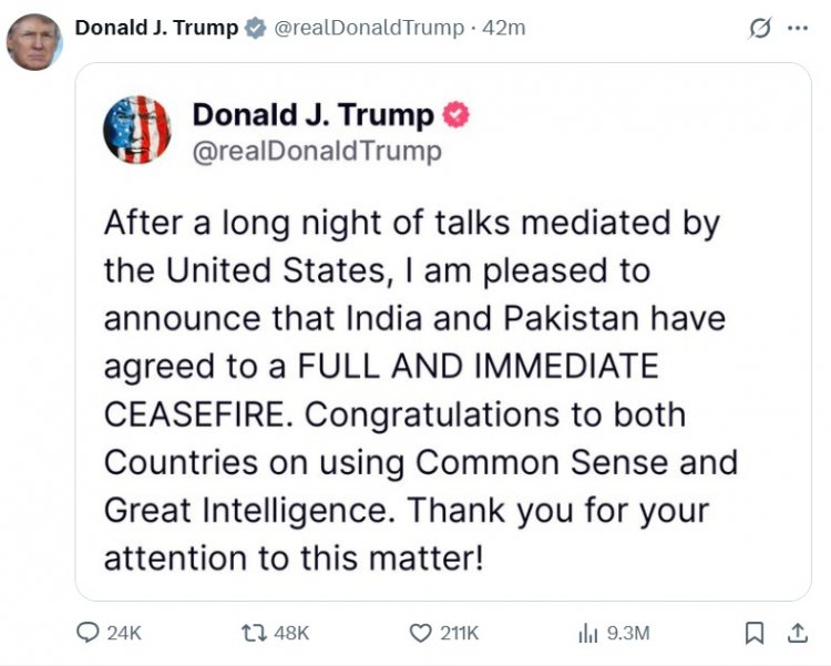 “After a long night of talks mediated by the United States, I am pleased to announce that India and Pakistan have agreed to a FULL AND IMMEDIATE CEASEFIRE. Congratulations to both countries on using Common Sense and Great Intelligence. Thank you for your attention to this matter!”